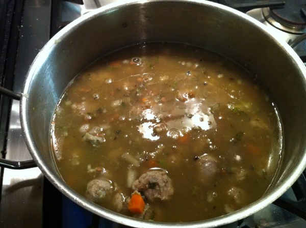 I don’t have measurements for this, as I don’t use any. You sort of have to judge quanities as you go. Above, you can see all the ingredients laid out. I use a basic Italian soffrito, or equal parts celery, onion and carrot diced relatively finely. In addition, I use garlic, sage, pork and leek sausages, and finally equal parts brown and puy lentils.